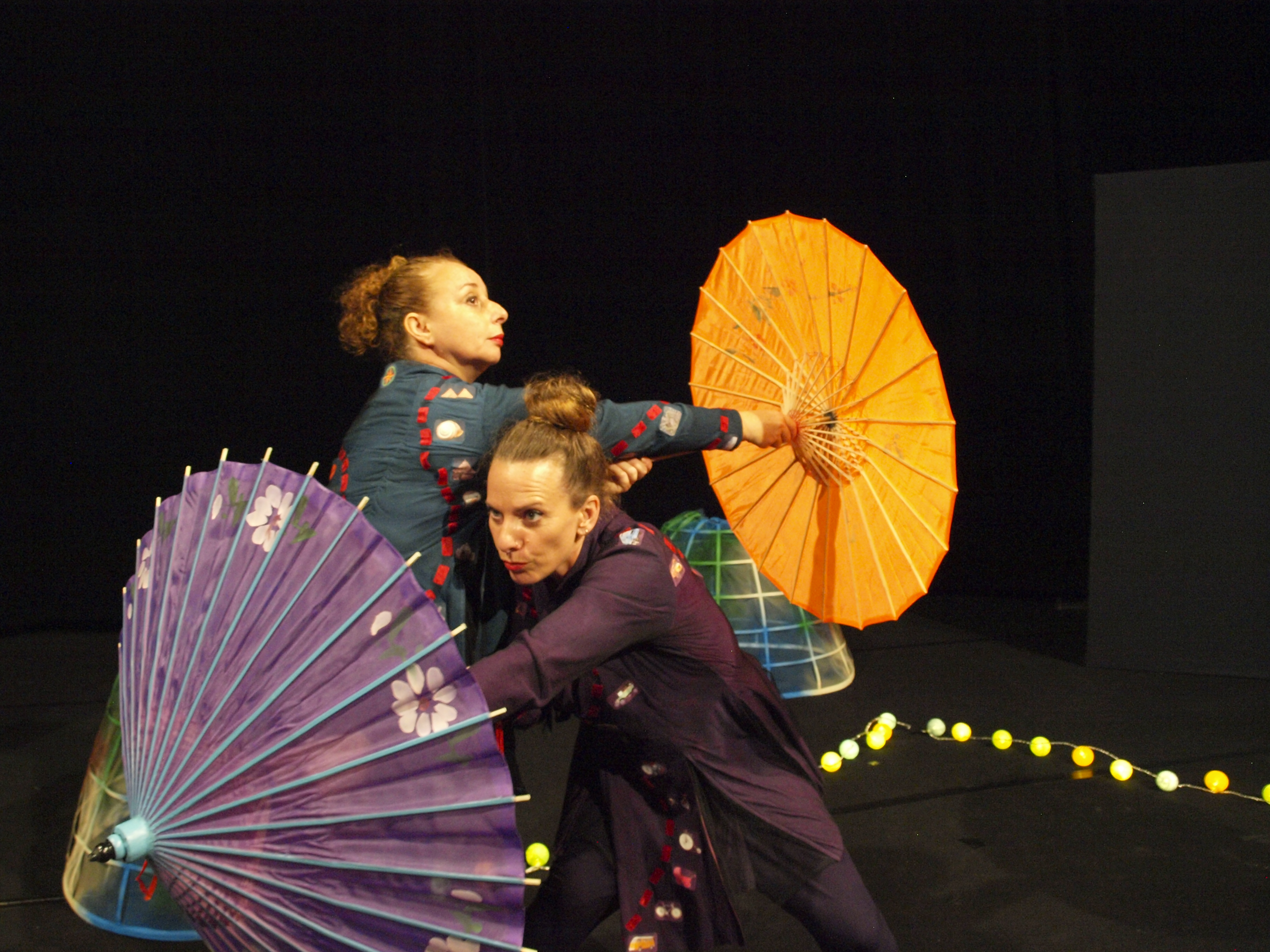 Sur la création sonore d’Eric Petit, les danseuses comédiennes construisent un monde musical chanté dansé et joué. Une scénographie minimaliste qui met en valeur le travail de la costumière Nicole Mandil, sur des robes cerceaux, maisons, cages, des porteuses de rêves.